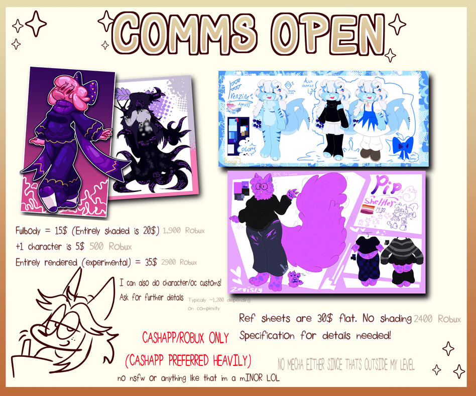 I accept PayPal, Ko-Fi, and Cashapp! In very rare occasions, I also do Robux!